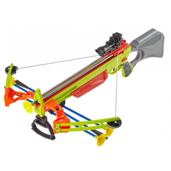 Іграшкові блочні арбалети ZIPP Toys з лазерним прицілом - ще один чудовий варіант для активного відпочинку, як на закритому майданчику, так і на свіжому повітрі. Арбалет виконаний з міцного і безпечного для здоров'я матеріалу. Дизайн арбалетів максимально наближений до реальних моделей, але наконечники в стрілах виготовлені у вигляді присосок. Це допомагає зробити процес гри не тільки цікавим, але і безпечним. У комплект входить 3 стріли. Для більш точного попадання в ціль, на арбалеті є лазерний приціл, який працює на 3-х батарейках типу AG10 / LR1130 (батарейки в комплект не входять). Як і в справжніх арбалетах, щоб уникнути випадкового пострілу, на арбалеті є запобіжник. Всі арбалети оснащені зручною текстурированним цівкою, яка відмінно лежить в руці, і ергономічним пістолетною рукояткою. Наявність ківери дозволяє носити з собою додаткові стріли. Збираються арбалети максимально просто - необхідно встановити плечі і зафіксувати їх за допомогою гвинтів, які йдуть в комплекті.