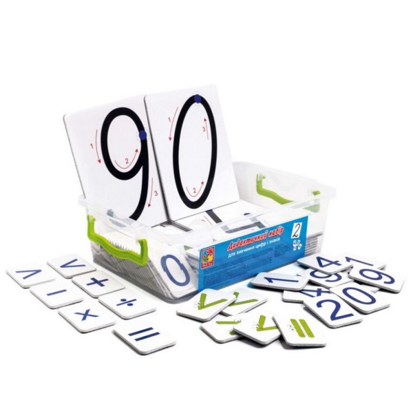 Комплектація: 10 магнітів з каліграфічним написанням цифр, 40 магнітів із зображенням друкованих цифр, 12 магнітів із зображенням математичних знаків, 12 магнітів із зображенням знаків для порівняння «Цифроїд».