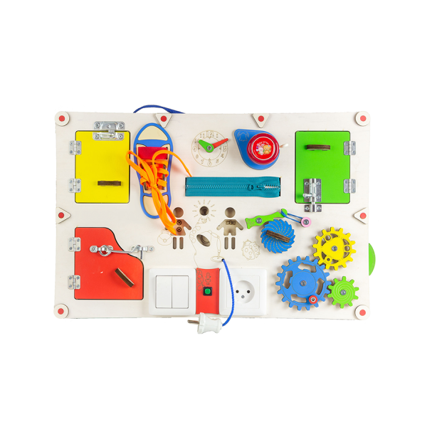 Розвиваюча дошка це традиційна дошка для раннього розвитку малюка. Саме бізідошки вперше були запропоновані італійським педагогом Марією Монтессорі для раннього розвитку дітей. Складна бізідошка - один з найбільш зручних видів розвиваючих іграшок, вона не займає багато місця, адже зручно складається, її можна легко прикріпити до стіни або ліжечка. Регулярні ігри з бізідошкою розвивають такі навички, як: -координація рухів; -дрібна моторика; -логіка; -пам'ять. Такі міні-розвиваючі центри також допоможуть вашому малюкові зробити перші кроки у вивченні букв, цифр, кольорів. На бізідошці розміщені дверцята, за якими можна розміщувати картки для вивчення. Також на дошці є годинник, який допоможе дитині вивчити цифри. Крім цього, різноманітні замочки, шестерінки, застібки та інші елементи дозволять малюкові освоюватися в навколишньому світі. Всього на дошці розташовано 11 ігрових елементів, які дозволять надовго зацікавити і захопити вашого малюка. Крім цього, складаний бізіборд в складеному вигляді виглядає як невелика валіза, його зручно брати з собою на відпочинок, в дорогу і подорожі. Розвиваючий бізіборд замінить дитині кілька звичайних іграшок, і крім гри допоможе з навчанням і розвитком. Ми використовуємо тільки екологічно чисті і перевірені матеріали, елементи ретельно опрацьовуємо та фарбуємо, а кріплення робимо надійними. Батарейки для підсвічування розміщені в батарейковому блоці закритого типу. Кожна іграшка сертифікована, тому ви можете бути спокійні щодо її безпеки для вашої дитини.