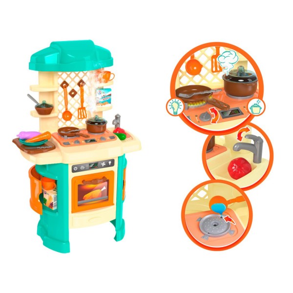 Нова інтерактивна «Кухня ТехноК» вражає своєю реалістичністю. У цій іграшці малюка зачарує різноманітність ефектів: яскрава червона підсвітка конфорки, звукові ефекти ("шипіння" і "булькання"), а головне - неймовірний ефект пара. З каструлі, в якій щось "вариться", піднімається білий пар. Але батьки можуть не хвилюватися - пар тільки вдала імітація, він насправді холодний і безпечний для дитини. Найкраще це спостерігати в темній каструльці з прозорою кришкою. Вашу увагу приверне колірне рішення іграшковій кухні. У новинці ми вирішили відмовитися від класичної, для таких іграшок, рожевої гами. Поєднання спокійних кремового і бірюзового, на думку дизайнерів, найкраще передає домашній затишок справжньої кухні. Таке колірне рішення буде відповідати не тільки мріям маленьких господинь, а і майбутніх шеф-кухарів. І, хто знає, можливо ця кухня стане для малюка першим кроком у захоплюючий світ сучасної "високої кулінарії». В наборі разом з іграшковій кухні весь необхідний посуд для приготування смачних страв. Є каструлька з прозорою кришкою (з отворами для проходження пара), сковорідка, дошка для нарізки і яскраві овочі. Дві картонні коробочки з «спагетті» та «пластівці» для приготування корисних сніданків, а для чаювання - дві чашки з блюдечками і цукорниця. А після смачного обіду - треба помити посуд. Для цього є мийка із краном і мочалка у формі квіточки. Такі сюжетно-рольові ігри добре розвивають фантазію і мислення дітей, допомагають сформувати навички приготування їжі та прибирання, вивчити правила поведінки з технікою на кухні. Елементи живлення - 3 батарейки типу АА (не входять в комплект). Іграшка для дітей від 3-х років. Будь ласка, дотримуйтесь правил експлуатації іграшковій кухні, зазначених в докладній інструкції. УВАГА! Перед першим использванием іграшки для ефекту пара рекомендуємо залити воду в бічні отвори правої конфорки заздалегідь (за 60 хв. до початку гри). Упаковка - яскрава коробка з ручкою (61 х 48 х 20 см)